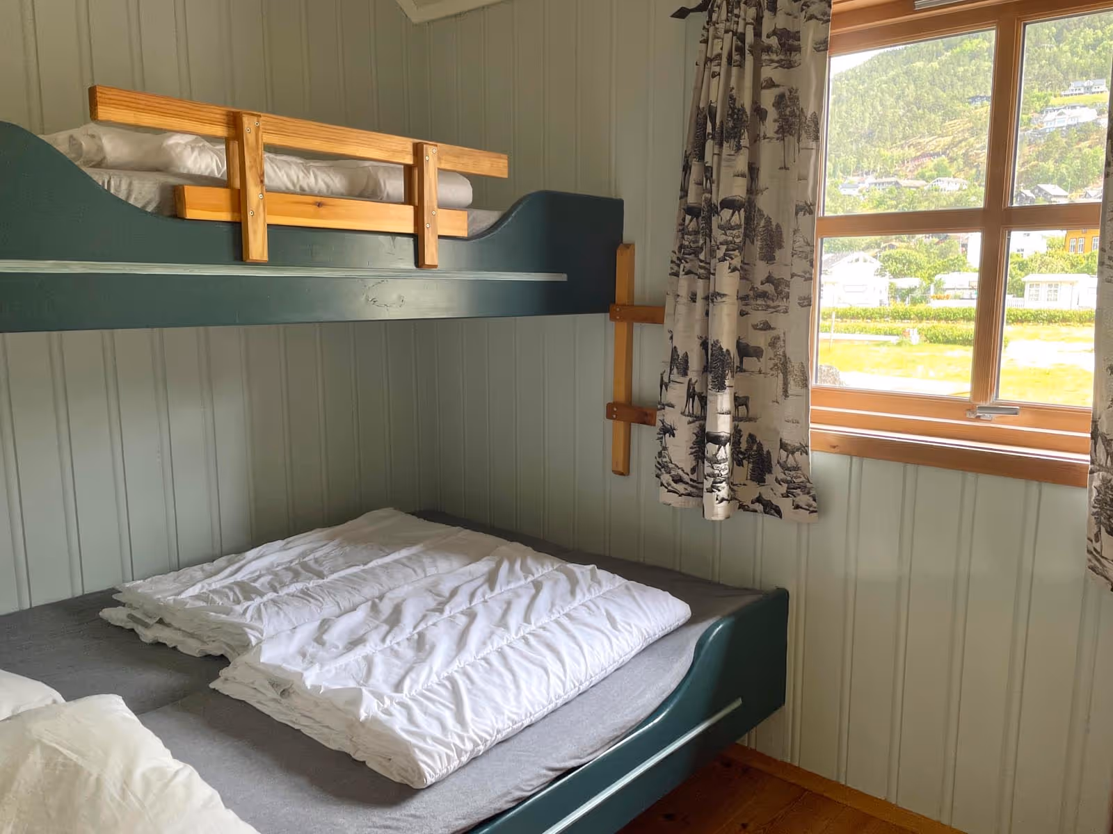 These three cabins appear to be completely similar, and are located as a "terraced house" along the Eio with a boathouse below. In these boathouses there are boats with space for 3 and 4hp engines, and these can be rented by those who rent the cabins. In the cabins there is a bedroom with a double bed, a bedroom with a family bunk (2 + 1) and two single beds on one loft above. stova. Fully equipped kitchen, bathroom with shower, washer / dryer, stove with Wifi / TV, and porch facing the fjord and river.
